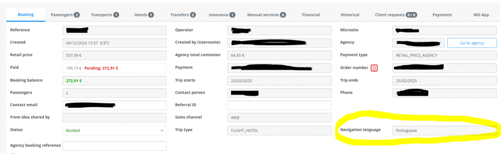 If you’ve sold a booking and need to know the navigation language used by the user to create this booking, in order to contact him, you have this information in the booking tab: