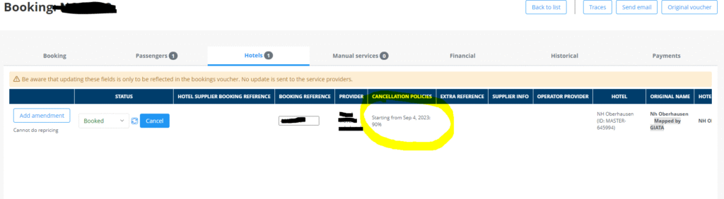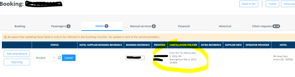 In this example, the hotel service will have a cancelation fee of 90% of the service cost startin on the 4th of September.