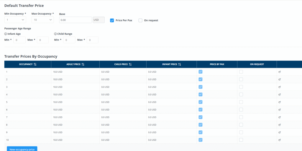 Or you can either use transfer prices by occupancy. If you load prices here it will take these prices instead of the default ones if the requested occupancy is loaded here. In the modality it will allow you to be more specific in the price loading, for excample in setting different prices per occupancy (the higher occupancy the cheaper it gets)