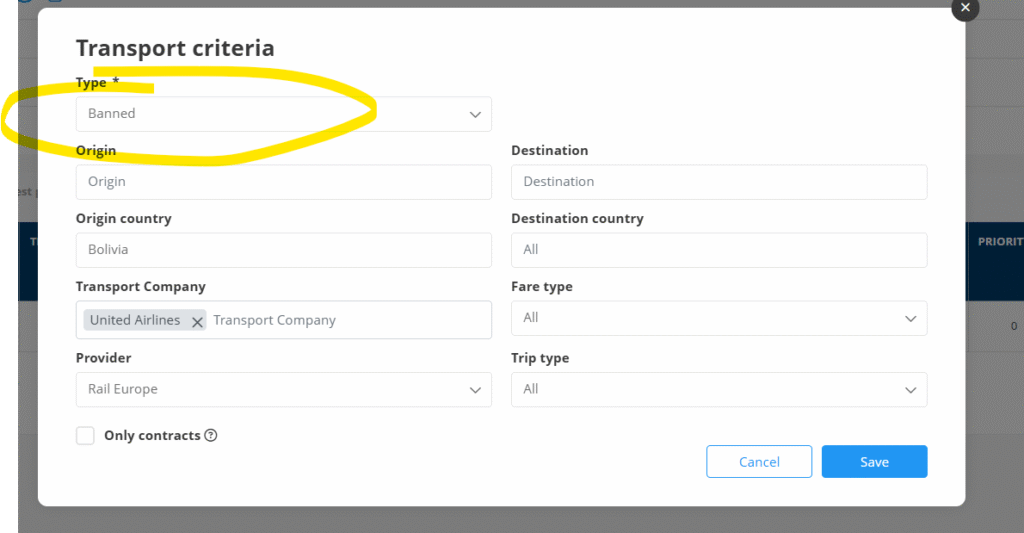 Compruebe el tipo de regla de prioridad exclusividad creada", "Baneado" y "tipo de transporte Baneado."